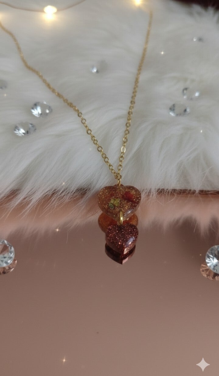 Kaskada Miłości i Światła. Wyjątkowy naszyjnik z dwoma sercami w formie wisiorków, połączonych kaskadowo. Górne serce, w ciepłym, złotym brokacie, zawiera drobne, kolorowe akcenty. Dolne serce to intensywny, miedziany blask. Całość zawieszona na delikatnym złotym łańcuszku. Idealny jako wyraz uczuć i uroczy, błyszczący dodatek.