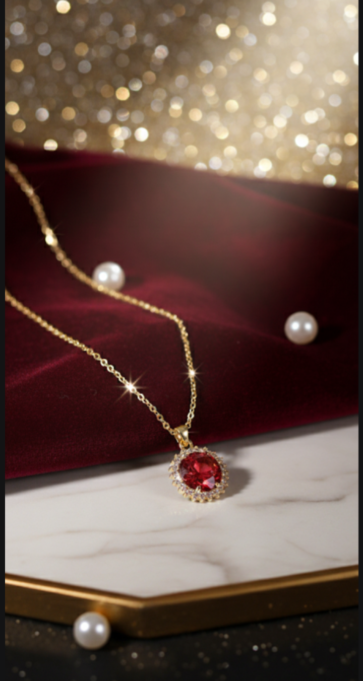 Ponadczasowa Klasa i Blask. Wykwintny naszyjnik z zatopionym brokatem w głębokim odcieniu czerwieni.,otoczony lśniącą aureolą drobnych kryształków, imitujących diamenty, co podkreśla jego blask. Całość zawieszona na delikatnym, złotym łańcuszku. To idealny dodatek na wielkie wyjścia i symbol luksusu.