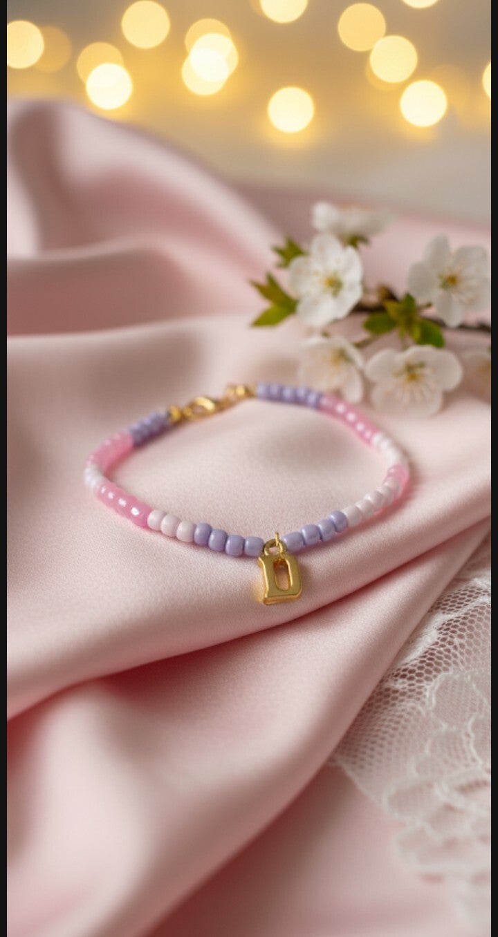 Spersonalizowany, Uroczy Akcent. Delikatna bransoletka wykonana z drobnych koralików w pastelowym gradiencie różu i lawendy. Całości dopełnia mała, złota zawieszka w kształcie inicjału (litery D). To idealny, spersonalizowany prezent lub subtelny dodatek dla miłośniczek romantycznego i dziewczęcego stylu.