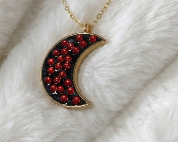 Wyjątkowy naszyjnik z zawieszką w kształcie półksiężyca (lunuli) w złotej oprawie. Ciemne wypełnienie zawieszki jest gęsto wysadzane drobnymi, intensywnie czerwonymi koralikami, które tworzą efektowną teksturę i tajemniczy kontrast. Ten symboliczny dodatek o etnicznym charakterze pięknie komponuje się ze złotym łańcuszkiem, dodając stylizacji odrobiny magii.